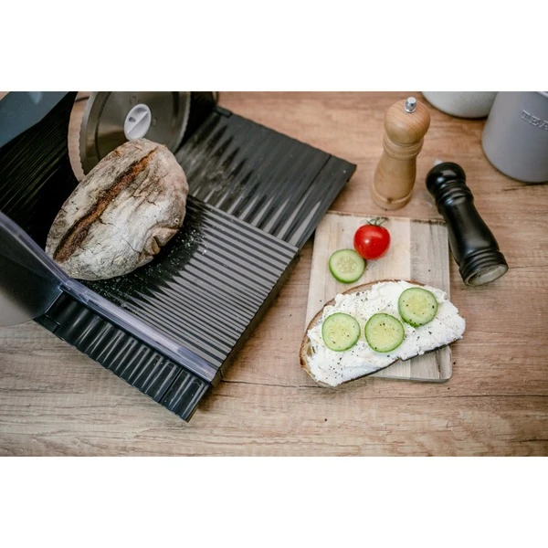 Der Allesschneider AS 100 verfügt über ein hochwertiges Edelstahlmesser mit Wellenschliff. Die Schnittstärke ist zwischen 0 bis 17 mm eingestellbar. Der Schlittenweg ist 16 cm lang und der leichtgängige Schlitten ist mit Handschutz und Lebensmittelhalter ausgestattet. Für weitere Sicherheit sorgt der doppelter Sicherheitsschalter. Abnehmbare Teile erleichtern die Reinigung. Art.-Nr.: 1818212