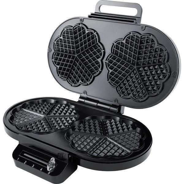 Das Doppel-Waffeleisen WE 2 von Steba eignet sich zur Zubereitung von zwei großen Waffeln in Herzform gleichzeitig (Backfläche Ø 15,5cm). Mit dem Waffeleisen WE 2 gelingen sie immer perfekt, genau wie man es mag, leicht gebräunt oder knusprig. Über einen Regler kann die Temperatur stufenlos geregelt werden. Für Bedienkomfort sorgen die Betriebs- und Temperaturkontrollleuchte. Die Antihaftbeschichtung sorgt dafür, dass der Teig an den Backplatten nicht haften bleibt, ermöglicht fettarmes Backen und erleichtert die Reinigung. Das schlichte und zeitlose schwarze Design passt perfekt in jede Küche.Art.-Nr.: 1755910