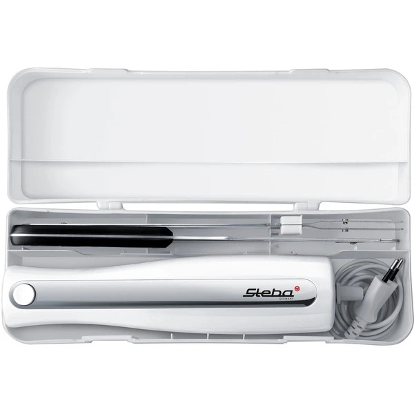 Das Eletromesser EM3 von Steba punktet durch ein ergonomisches Gehäuse und seine hochwertige Ausstattung. Mit einer Leistung von 120 Watt arbeitet es kraftvoll und leise. Per Knopfdruck lassen sich die Klingen ganz einfach tauschen. Im Lieferumfang sind eine Fleischgabel und eine Aufbewahrungsbox enthalten. Für eine einfache Reinigung sind die Messer und die Fleischgabel spülmaschinengeeignet. Für eine sichere Handhabung sorgt der Sicherheitsschalter. Art.-Nr.: 1533924