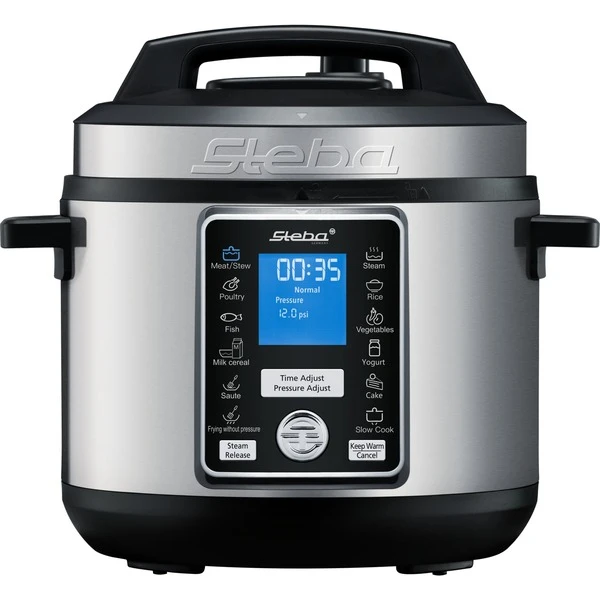 Der Multikocher/ Schnellkochtopf DD 3 Smart von Steba eignet sich für die zeitsparende und schonende Zubereitung von Gemüse, Fleisch, Fisch u.v.m. und das mit bis zu 70% kürzeren Garzeiten. Der herausnehmbare 6 l Edelstahl-Innentopf bietet 5 l Nutzinhalt. Der Dampfdruck ist individuell einstellbar (0,1 – 0,8 bar) und der DD 3 Smart verfügt über 12 Automatikprogramme, die nach den persönlichen Wünschen angepasst werden können. Dank smarter Abdampf-Funktion mit intelligenten Drucksensoren ist kein manuelles Abdampfen mehr nötig. Für weiteren Komfort sorgen das große LCD-Display, die Warmhaltefunktion, das 9-fach Sicherheitssystem und das Cool-Touch Edelstahlgehäuse. Art.-Nr.: 1818193