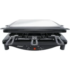 Das Premium Raclette Black Steel RC 7 bietet Platz für acht Raclette-Pfännchen. Die Pfännchen sind schneid- und kratzfest und können in der Spülmaschine gereinigt werden. Die Grillfläche beträgt 26 cm x 26 cm und zum Zubereiten der verschiedensten Speisen ist das Raclette mit einer wendbaren Edelstahl-Grillplatte ausgestattet. An der Vorderseite des Black Steel RC 7 befindet sich ein stufenloser Temperaturregler sowie ein Ein-/Ausschalter. Art.-Nr.: 1667434