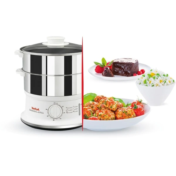 Mit dem Convenient Series VC1451 Dampfgarer lässt sich ganz einfach jeden Tag eine gesunde Mahlzeit kochen. Dank der 60-Minuten-Timer mit automatischer Abschaltung und akustischem Alarm ist die Bedienung ein Kinderspiel. Der Wasserbehälter fasst 6 Liter und der Wasserstand kann am Gerät abgelesen werden. Durch die externe Wassereinfüllöffnung kann auch während des Garens Wasser nachgefüllt werden. Für eine kompakte Aufbewahrung lassen sich die Edelstahlschalen stapeln.
