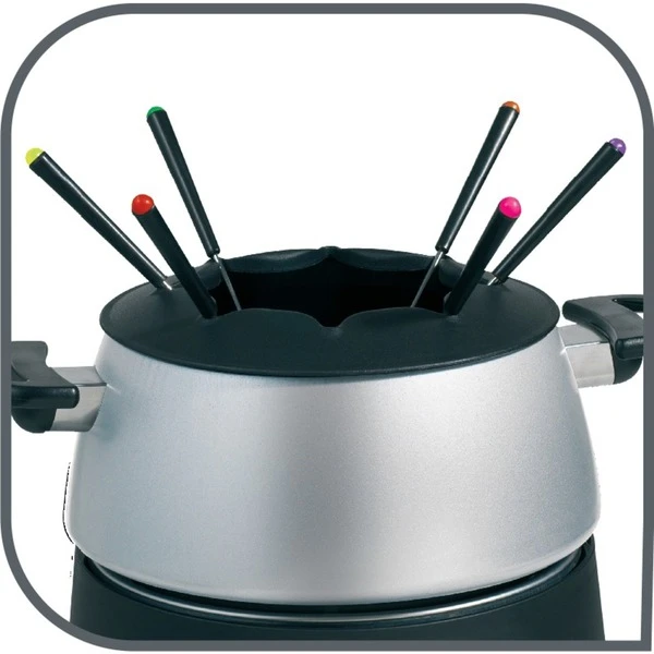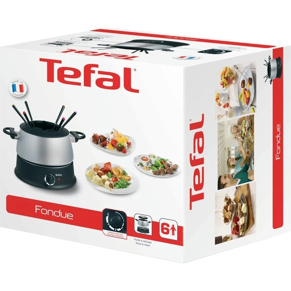 Das Tefal Fondue EF 3000.10 hat einen großen antihaftbeschichteten Aluminium-Topf mit wärmeisolierten Griffen. Desweiteren besitzt das Fondue EF 3000.10 sechs Fonduegabeln mit wärmeisolierten Griffen und einen Thermoplastiksockel in modernem Design. Der Spritzschutz mit Gabel-Halter vermeidet unnötige Spritzer und bringt Ordnung in den Fonduetopf. Das Fondue EF 3000.10 ist für sechs Personen geeignet. Mit dem regelbaren Thermostat lässt sich die optimale Gartemperatur einstellen.Art.-Nr.: 950902