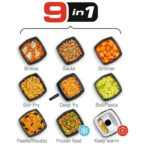Der Versalio Deluxe 9in1 Multikocher von Tefal eignet sich zum Braten, Frittieren, Köcheln, Schmoren, Sautieren, Kochen von Pasta, Paella/Risotto, zur Zubereitung von Tiefkühlgerichten und zum Warmhalten. Er kann bis zu 1,3 kg Gargut aufnehmen und überzeugt mit einer Leistung von 1600 Watt. Dank dem regelbaren Thermostat mit Temperaturkontrollleuchte und dem Sichtfenster kann auf den Punkt frittiert werden. Für eine einfache Reinigung ist der Innenbehälter der Versalio Deluxe 9in1herausnehmbar und antihaftbeschichtet. Innenbehälter, Frittierkorb und Deckel sind darüber hinaus spülmaschinengeeignet. Das Thermogehäuse ist wärmeisoliert um so Verletzungen bei der Bedienung zu verhindern. Wie vielseitig die Versalio Deluxe 9in1 ist zeigt sich an den verschiedenen auswählbaren Programmen wie Braten, Frittieren, Schmoren, Kochen und Köcheln. Zu guter Letzt rundet die integrierte Warmhaltefunktion die Versalio Deluxe 9in1 den Multicooker ab.Art.-Nr.: 1233557