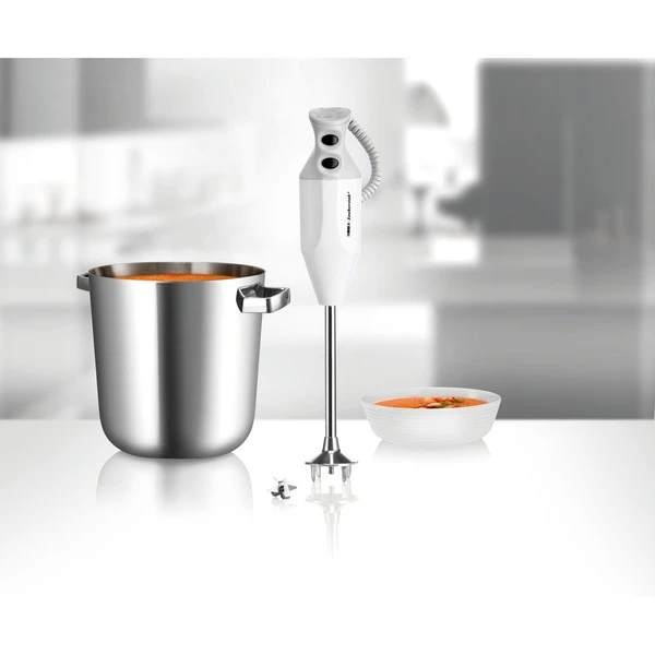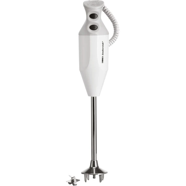 Mit dem ESGE-Zauberstab P 350 Profi kommt ein leistungsstarkes Kraftpaket in die Profi-Küche, denn der langlebige, robuste AC-Motor sorgt mit 350 Watt dafür, dass per Sicherheits-Twinschalter wahlweise mit 18.000 oder 22.000 Umdrehungen pro Minute gearbeitet werden kann. Behälter mit bis zu 20 Liter Flüssigkeit können mühelos eingesetzt werden, denn die längere Antriebswelle ist für eine Eintauchmenge bis circa 29 Zentimeter ausgelegt. Bewegungsfreiheit wird durch das Spiralkabel gesorgt, denn es ist bis zu einer Länge von 150 Zentimetern ausziehbar. Der kleine Alleskönner zerkleinert nicht nur Eiswürfel, er quirlt, hackt, rührt, püriert, passiert und mixt – damit ist der ESGE-Zauberstab P 350 Profi auf alle kulinarischen Eventualitäten eingestellt! Die Aufsteckzentrierung sorgt dafür, dass das Multimesser schnell und komfortabel eingesetzt werden kann.Art.-Nr.: 1670940