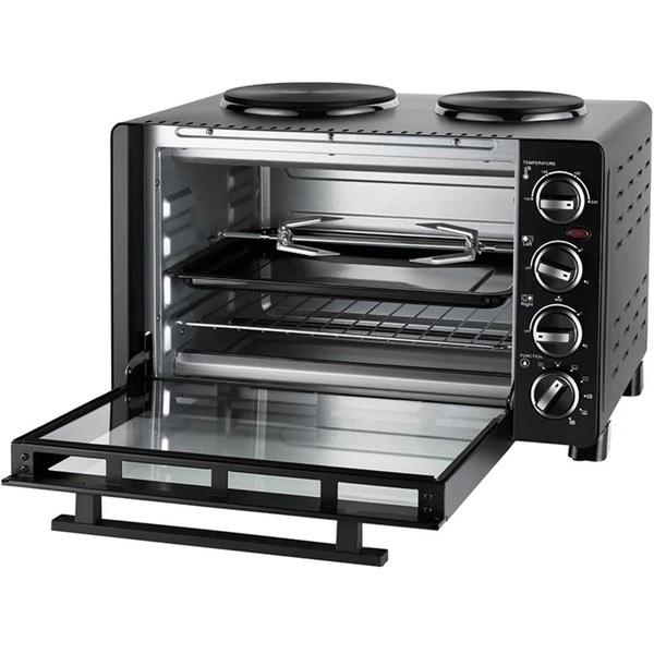 | Ausstattung | Doppelglastür, Drehspieß, Kochplatten | ||