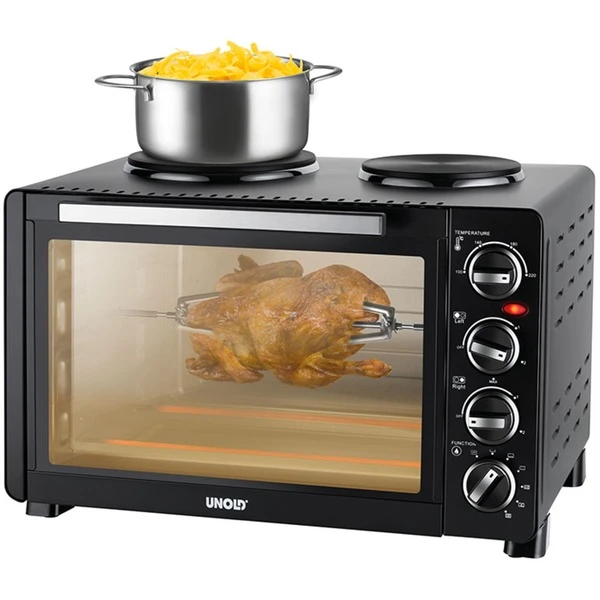 Einraum-Appartement? Studentenbude? Schrebergarten-Häuschen? Oder nur wenig Platz? Etwas Leckeres kochen ist auch da kein Problem – mit der Kleinküche All in One 68885 von Unold. Sie bietet einen 30-Liter-Innenraum und zwei Kochplatten. So kann gebacken, gegrillt, gekocht oder auch ein Hähnchen am Drehspieß auf Knusperform gebracht werden. Die Kochplatten und der Backofen können gleichzeitig genutzt werden. Auf den Kochplatten können Töpfe und Pfannen mit circa 18,5 und circa 14,5 cm eingesetzt werden, im Ofen ist Platz für Pizza- und Backformen mit circa 25 cm. Mit der einstellbaren Ofentemperatur von 100°C bis 220°C ist vom Gratinieren bis zu krosser Pizza alles möglich. Wahlweise mit der Kombi aus Ober-/Unterhitze oder separat einstellbar. Das hitzeisolierte Außengehäuse und die doppelverglaste Tür helfen beim Energiesparen. Die schwarze Kompaktküche wird von umfangreichem Zubehör begleitet. Grillrost und Grillrostheber sowie ein Backblech und der Drehspieß mit Halteklammern für Hähnchen oder Spießbraten sind im Lieferumfang enthalten. Und die Bedienungsanleitung liefert leckere Rezeptideen frei Haus mit.Art.-Nr.: 1632852