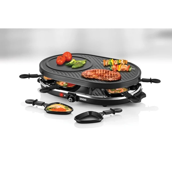 Gemütliche Stunden am Esstisch, mittendrin das Raclette Gourmet, da kann ein gemütlicher Abend mit Familie und/ oder Freunden entspannt und genussvoll verbracht werden! In den acht antihaftbeschichteten Pfännchen brutzeln und gratinieren die leckeren, nach persönlichem Gusto komponierten Beilagen und auf der großzügigen Grillplatte werden derweil Fleisch oder Gemüsespieße, mariniertes Gemüse oder leckere Gambas zubereitet. Entschleunigt genießen! Die antihaftbeschichtete Grillplatte mit ihren glatten und geriffelten Grillflächen ist auf alle kulinarischen Anforderungen eingestellt. Die stufenlose Temperaturregelung sorgt dafür, dass alles perfekt gegrillt, gebraten und gegart wird! Ist alles parat, auf niedrigste Temperatur stellen, so bleiben die Köstlichkeiten immer auf Genusstemperatur! Durch die wärmeisolierten Griffe lassen sich die lecker befüllten Pfännchen gefahrlos entnehmen. Die Antirutschfüße sorgen dafür, dass das Raclette Gourmet sicher steht. Inspirierende Rezeptideen werden mit der Bedienungsanleitung frei Haus mitgeliefert.Art.-Nr.: 1632839