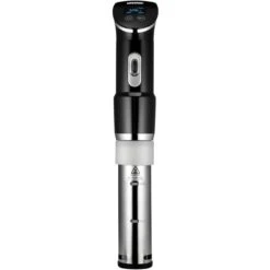 Fleisch, Fisch oder Gemüse werden, vakuumiert in entsprechenden Beuteln, beim Sous-Vide Garen auf gleichbleibender Temperatur behutsam und fettfrei gegart, so dass Vitamine und Mineralien geschont werden und erhalten bleiben. Fleisch und Fisch bekommen dann gegebenenfalls noch einen kurzen „Bratgang“, damit sich leichte Röstaromen entwickeln und fertig ist perfekt gegartes Essen. Der Sous-Vide Stick Time von Unold ist bei dieser Garmethode der ideale Partner. Er erwärmt bis zu 20 Liter Wasser in einem Topf oder einem anderen hitzebeständigen Gefäß, die Mindesthöhe sollte 18 Zentimeter betragen. Ist das Wasser auf der gewünschten Temperatur, kann das vakuumierte Gargut eingelegt werden. Der Sous Vide Stick Time erwärmt mit seinen 1.300 Watt das Wasser bis auf +/- 0,2 Grad Celsius exakt, die gewünschte Temperatur kann in 0,5-Grad-Schritten eingestellt werden. Während des Garprozesses wird der Wärmegrad konstant gehalten, dafür sorgt die leistungsfähige Umwälzpumpe im Sous-Vide Stick Time. Ausgestattet mit einer Timerfunktion (bis zu 60 Stunden), bietet der selbstverständlich BPA-freie Sous-Vide Stick Time natürlich auch eine Abschaltautomatik bei zu niedrigem Wasserstand. Angenehm ist das abgeschrägte LCD-Display, so lassen sich Zeit und Temperatur bequem ablesen. Für Sous Vide-Neulinge liefert Unold neben der aussagekräftigen Bedienungsanleitung auch erprobte Rezepte für den Start in diese gesunde Garmethode mit.Art.-Nr.: 1446053